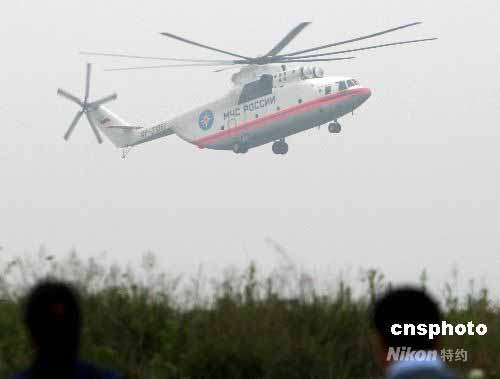 5月25日下午5時45分,俄羅斯米格—26大型運輸機(jī)飛抵綿陽機(jī)場,支援唐家山堰塞湖排險工作。中新社發(fā) 趙振清 攝