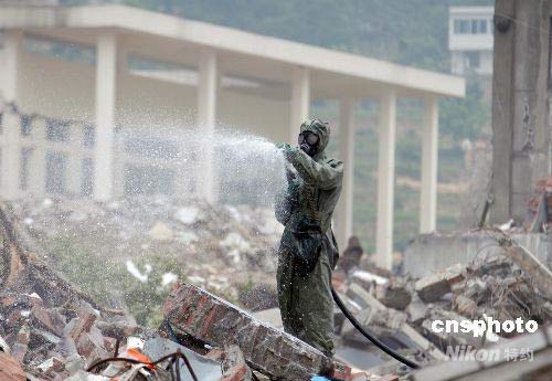 防化兵在對北川中學(xué)教學(xué)樓廢墟重點(diǎn)消毒。