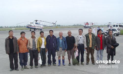 5月29日下午,被困17天的10名清平磷礦礦工,被民航直升機救出。剛走下飛機的被救礦工付學(xué)斌說,這17天來靠吃野菜和直升機空投的食品維持生命。5月12日那天,地震時他們都在磷礦上班,傷亡不是很大,主要是在家的親人都被這次地震給吞沒了。執(zhí)行這次營救任務(wù)的是中信海直的AS332型7961號和東方通用航空的米171型7856號飛機。據(jù)民航直升機抗震指揮部副總指揮關(guān)立欣講,受天氣影響,全天共出動直升機10架次,執(zhí)行飛行任務(wù)24架次,運進救災(zāi)物資10.1噸,救援人員13人,接運出被困群眾和傷員47人,財務(wù)檔案600公斤。中新社發(fā) 張鈺昱 攝