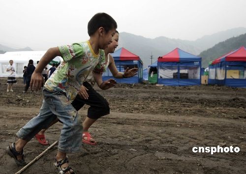 圖:劫后余生的孩子們在災(zāi)區(qū)空地上賽跑