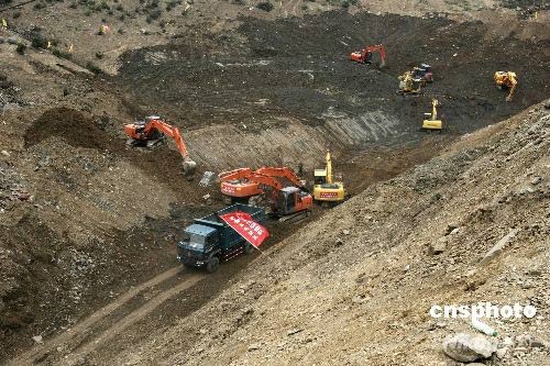 5月31日,唐家山堰塞湖瀉流槽已基本挖通,目前堰塞湖的水位離堰塞湖槽的出水有7米的距離,將采取自然泄洪的方法分洪,不再進行爆破,分洪的時間要根據(jù)上游的來水量確定,大概時間在6月1日到6月5日之間。中新社發(fā) 杜洋 攝