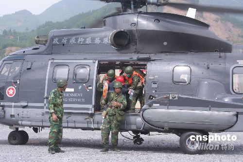 圖為香港特區(qū)政府飛行服務(wù)隊一架直升機載著獲救礦工降落在四川廣漢機場。中新社發(fā) 潘其武 攝