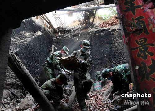 6月2日,進(jìn)村入戶參加抗震救災(zāi)的鐵軍官兵在海拔2000多米高的汶川縣威州鎮(zhèn)布瓦村村民王健華家清理在地震中倒塌的房屋。中新社發(fā) 曾憲平 攝