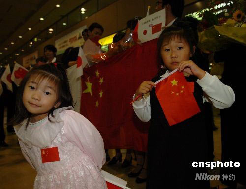 圖為兩名正在成田機(jī)場等待迎接日本醫(yī)療隊(duì)的中國小女孩。中新社發(fā) 朱沿華 攝