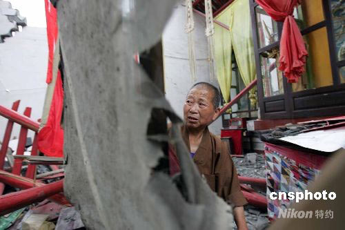 6月4日,四川綿竹漢旺鎮(zhèn)云霧寺的尼姑,回到被地震毀壞的寺廟,看到滿目瘡痍的景象頗為無(wú)奈。中新社發(fā) 慎重 攝