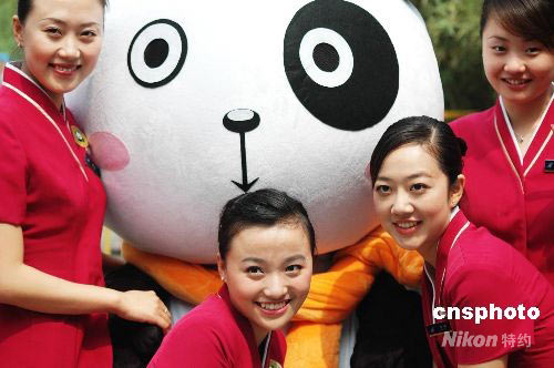 6月5日上午,8只四川臥龍大熊貓首次在北京動(dòng)物園新家與游客見面。前來參觀的群眾用不同方式表達(dá)對(duì)大熊貓的喜愛。圖為參加首日見面儀式的南方航空公司空姐與大熊貓吉祥物合影。中新社發(fā) 魏瑋 攝