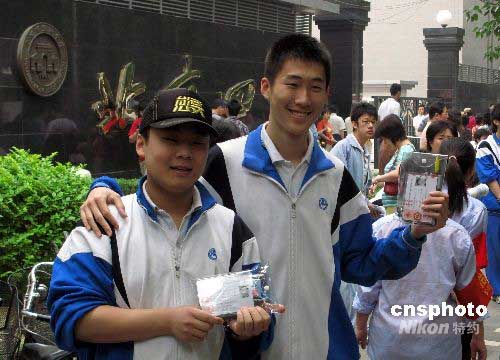 6月7日上午,“北京市2008年普通高等學(xué)校招生全國統(tǒng)一考試”第一天,地處北京西皇城根的京城名校北京四中考點門前,考生寧碩碩(左)一早便和同學(xué)匯聚,等待進入考場。中新社發(fā) 鄒憲 攝