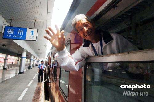 圖為列車(chē)發(fā)車(chē)前呂天其老人與前來(lái)送行的有關(guān)人員揮手道別。中新社發(fā) 劉可耕 攝