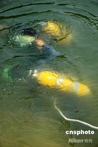 經過4名潛水員近2個小時的連續(xù)作業(yè),終于將水庫最底下的2個放水口拉開。中新社發(fā) 李唐 攝
