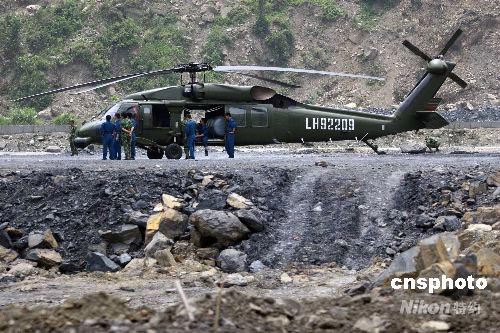 6月10日,四川映秀鎮(zhèn)空地上一架黑鷹直升飛機(jī)正在原地待命。當(dāng)天早晨,在四川地震救援中失事的陸航團(tuán)米-171直升機(jī)殘骸在映秀鎮(zhèn)附近的火燒扛3511高地被發(fā)現(xiàn),由于失事地點(diǎn)路途艱險(xiǎn),集結(jié)在映秀鎮(zhèn)的救援部隊(duì)正在等待進(jìn)一步指令。中新社發(fā) 劉新 攝