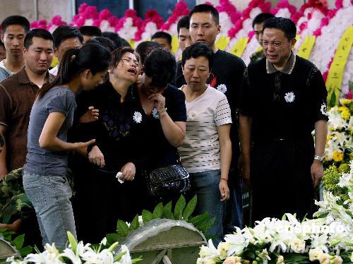 6月13日,四川大地震救援中失事直升機(jī)遇難機(jī)組人員遺體告別儀式在成都市殯儀館舉行,來(lái)自軍方及社會(huì)各界的人士紛紛前來(lái)送別英雄。圖為遇難機(jī)組人員家屬悲痛欲絕送別親人。中新社發(fā) 劉新 攝