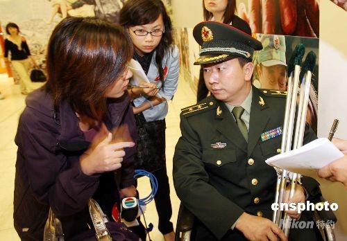 “大愛無疆—汶川大地震抗震救災(zāi)圖片展”在香港展覽中心展出,大會邀請到抗震救災(zāi)第一線的英雄成都軍區(qū)的鐘良軍在開幕式上作報告。中新社發(fā) 洪少葵 攝