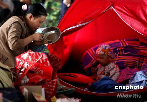 一位年輕母親正和在地鋪小帳篷里的愛子同吃午餐。中新社發(fā) 賈國榮 攝