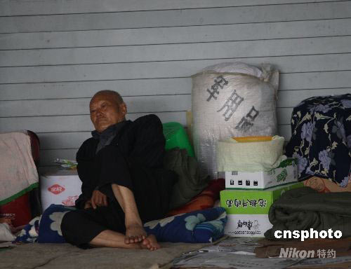 北川縣一位家園被毀的老人倚靠在地鋪上陷入沉思。中新社發(fā) 賈國(guó)榮 攝