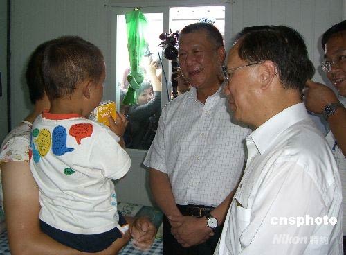 6月28日上午,香港特別行政區(qū)行政長(zhǎng)官曾蔭權(quán)、澳門(mén)特別行政區(qū)行政長(zhǎng)官何厚鏵一行來(lái)到彭州市小漁洞鎮(zhèn)江橋村大楠社區(qū)安置點(diǎn),慰問(wèn)當(dāng)?shù)厥転?zāi)群眾,了解抗震救災(zāi)情況。中新社發(fā) 郭嘉農(nóng) 攝