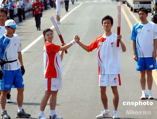 7月9日,奧運火炬在內(nèi)蒙古鄂爾多斯進(jìn)行傳遞。圖為火炬手黃逸捷、朱小芳正在交接火炬。中新社發(fā) 廖攀 攝