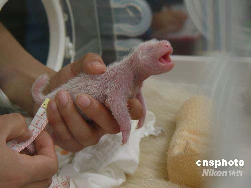 中國保護(hù)大熊貓研究中心雅安碧峰峽基地工作人員給熊貓幼仔量身長。中新社發(fā) 羅小韻 攝