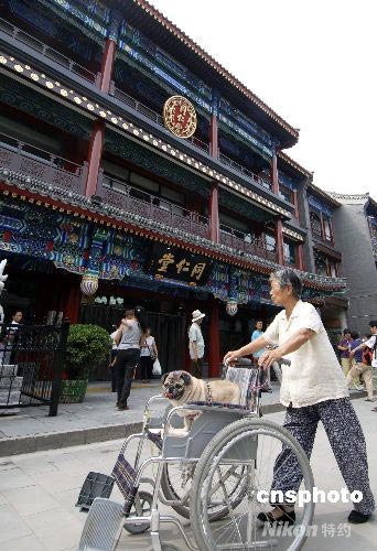 7月30日,一位老人到重新開業(yè)的大柵欄街遛狗。當日,有著近500年歷史的北京大柵欄商業(yè)街完成近年來最大規(guī)模改造后重張迎客。中新社發(fā) 王東明 攝