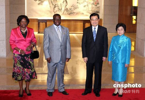9月17日,中國(guó)國(guó)家主席胡錦濤與夫人劉永清在北京釣魚臺(tái)國(guó)賓館芳菲苑舉行宴會(huì),歡迎出席北京殘奧會(huì)閉幕式的國(guó)際貴賓。圖為胡錦濤與夫人迎接幾內(nèi)亞比紹總統(tǒng)維埃拉夫婦。中新社發(fā) 廖文靜 攝