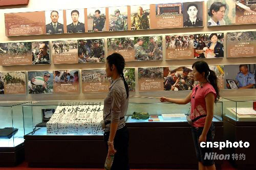 9月20日上午,中國人民革命軍事博物館青年講解員正在為“‘萬眾一心 眾志成城’--抗震救災主題展覽”欄目背誦講解詞。由中共中央宣傳部、國家發(fā)展和改革委員會、解放軍總政治部共同主辦的此項展覽,將于9月21日正式對公眾開放。該展覽為汶川大地震后,北京舉辦的反映抗震救災工作,規(guī)模最大,文物最多,圖片形象最為詳盡的展覽之一。中新社發(fā) 鄒憲 攝