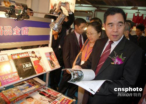 9月20日,第四屆海峽兩岸圖書交易會在臺北世貿(mào)中心三館開幕,中新社主辦的《中國新聞周刊》現(xiàn)身第四屆海峽兩岸圖書交易會。圖為大陸參訪團團長、新聞出版署署長柳斌杰參觀大陸期刊綜合展區(qū)時,觀看《中國新聞周刊》。中新社發(fā) 陳立宇 攝