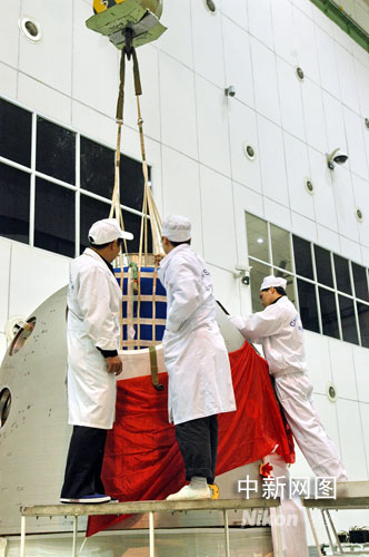 中國神舟七號載人航天飛船發(fā)射在即。圖為神舟七號返回艙起吊(資料圖片)。袁明月 攝