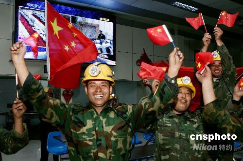 9月25日晚,安徽淮北安徽恒源煤電公司的礦工們揮舞國旗歡呼“神七”發(fā)射成功。當日,該公司上千名礦工收看了神舟七號飛船發(fā)射的電視直播。中新社發(fā) 黃啟軍 攝