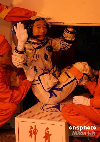 景海鵬進(jìn)入神舟七號(hào)飛船返回艙。中新社發(fā) 秦憲安 攝