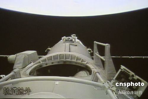 北京時(shí)間九月二十七日下午四點(diǎn)五十九分,神舟七號(hào)航天員翟志剛成功出艙,實(shí)現(xiàn)中國歷史上第一次太空行走。圖為神舟七號(hào)軌道艙門打開的瞬間(攝于北京航天飛控中心大屏幕)。中新社發(fā) 齊彬 攝
