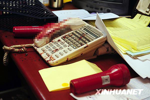 韓國首都首爾發(fā)生縱火行兇事件的旅館,管理辦公室內(nèi)的電話上沾滿了被害人的鮮血。新華社/紐西斯通訊社
