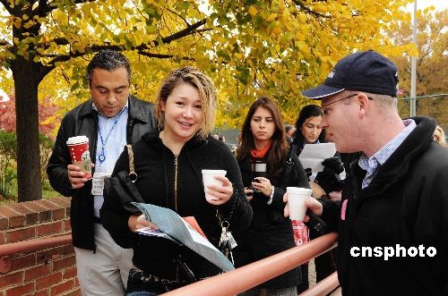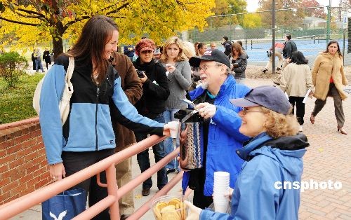 在臨近華盛頓的弗吉尼亞阿靈頓郡中心圖書館投票站,很多選民因?yàn)槠鸬迷,沒有吃早飯,此時(shí)來了兩位送餅干和熱咖啡的。可是,這兩位開口就問:你是奧巴馬的投票者么?一位女士說“Yes!”,于是馬上咖啡餅干免費(fèi)奉上。中新社發(fā) 邱江波 攝