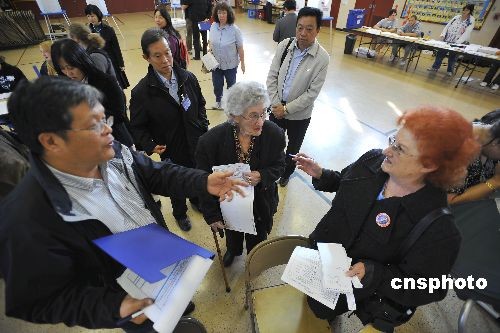 當(dāng)?shù)貢r(shí)間十一月四日,是美國(guó)總統(tǒng)選舉投票日。來自北京的一考察團(tuán)在加州舊金山灣區(qū)十余個(gè)投票站考察并體驗(yàn)投票過程。圖為一位中國(guó)學(xué)者在和美國(guó)選民交流。 中新社發(fā) 陳鋼 攝