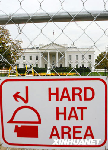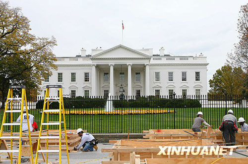 11月5日,在美國首都華盛頓,建筑工人在白宮北門搭建觀禮臺。已當選下屆美國總統(tǒng)的奧巴馬2009年1月在國會宣誓就職后,將在這里舉行慶祝儀式。白宮、國會等處目前正在進行新總統(tǒng)就職典禮的搭臺施工,準備迎接奧巴馬宣誓就職。新華社記者 侯俊 攝