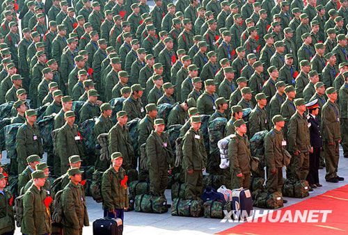 12月10日,新兵們在歡送儀式上列隊。當(dāng)日,江蘇省暨南京市歡送新兵入伍儀式在南京火車站廣場舉行,全省1240多名新兵從這里起程,奔赴軍營。孫參 攝(圖片來源:新華網(wǎng))