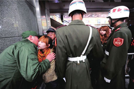 一名新兵與家人耳語道別。10日下午,北京今冬第一批450名新兵在北京西站啟程,乘坐T579次列車奔赴石家莊等地軍營。張斌 攝(圖片來源:京華時報)