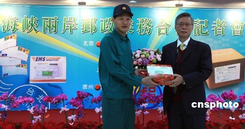 12月15日上午9時15分,臺灣“中華郵政”董事長吳民佑(右)將臺灣直接通郵寄往大陸的第一份郵件交到郵遞員手中。