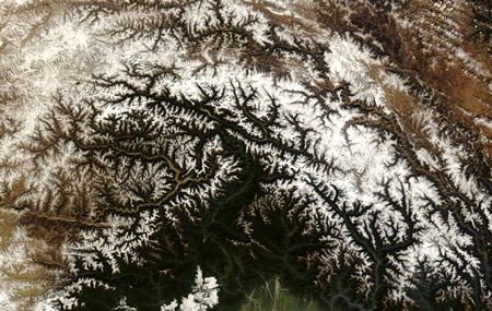 青藏高原冬季衛(wèi)星圖:NASA土地衛(wèi)星上高清代分光成象儀(MODIS)拍攝到了青藏高原的真彩圖片,可以看到被稱為"世界屋脊"的高原上,山頂?shù)狞c點積雪和部分結冰的湖面。