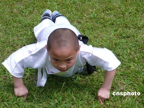 北京元鴻少林功夫團抵臺進行武術(shù)交流。圖為“大力神童”陸地在臺北表演一指禪俯臥撐。中新社發(fā) 鄧敏 攝
