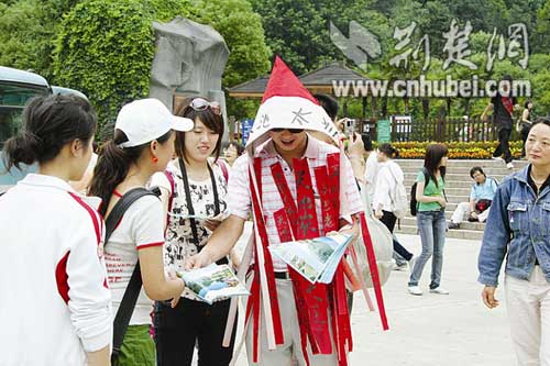 24日,湖北武漢黃陂木蘭山天池景區(qū)門(mén)前,一男子頭戴尖帽,身上掛滿(mǎn)紅紙條,在熙熙攘攘的人流中十分顯眼。該男子稱(chēng),他正為一家“農(nóng)家樂(lè)”酒店做宣傳,游客憑著他身上的紙條消費(fèi),可享受優(yōu)惠。據(jù)介紹,近年來(lái)木蘭景區(qū)游客量大增,“農(nóng)家樂(lè)”如雨后春筍冒出,競(jìng)爭(zhēng)激烈。