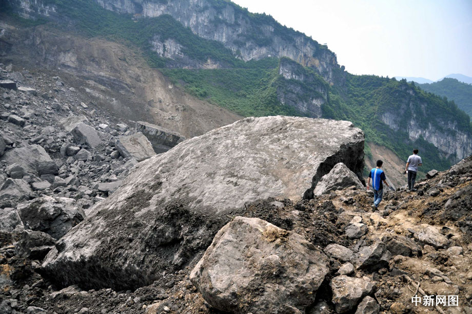 山谷谷底,從山體上垮塌而下的巨石隨處可見,這一塊高達20余米巨石和其他土石將三聯(lián)采礦場的礦井口掩埋。 曹多然 攝