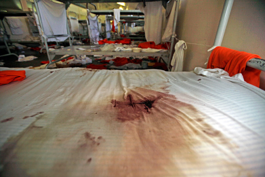 圖為奇諾監(jiān)獄宿舍被血染紅的床鋪。8月8日晚至9日凌晨,美國(guó)加州南部奇諾市發(fā)生大規(guī)模監(jiān)獄騷亂,截至目前,在250多名受傷的在押犯人中,仍有16名犯人在醫(yī)院接受治療。