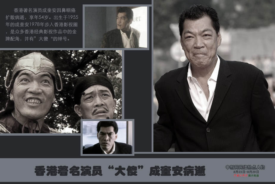 中新網(wǎng)本周熱點人物之——成奎安 北京時間27日晚23時45分,香港著名演員成奎安因鼻咽癌擴(kuò)散病逝,享年54歲。出生于1955年的成奎安1978年步入香港影視圈,是眾多香港經(jīng)典影視作品中的金牌配角,并有”大傻“的綽號。
