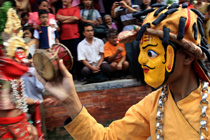 圖為節(jié)日當(dāng)天人們戴上傳統(tǒng)的尼泊爾面具載歌載舞。