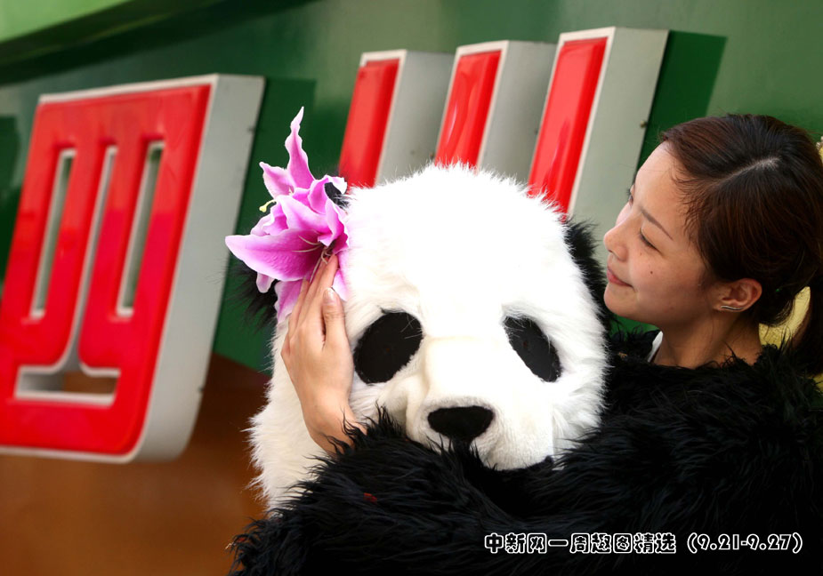 9月24日,來自四川“奮進四川彩車”的美女演員排練之余精心打扮道具。圖片來源:中國新聞網(wǎng)
