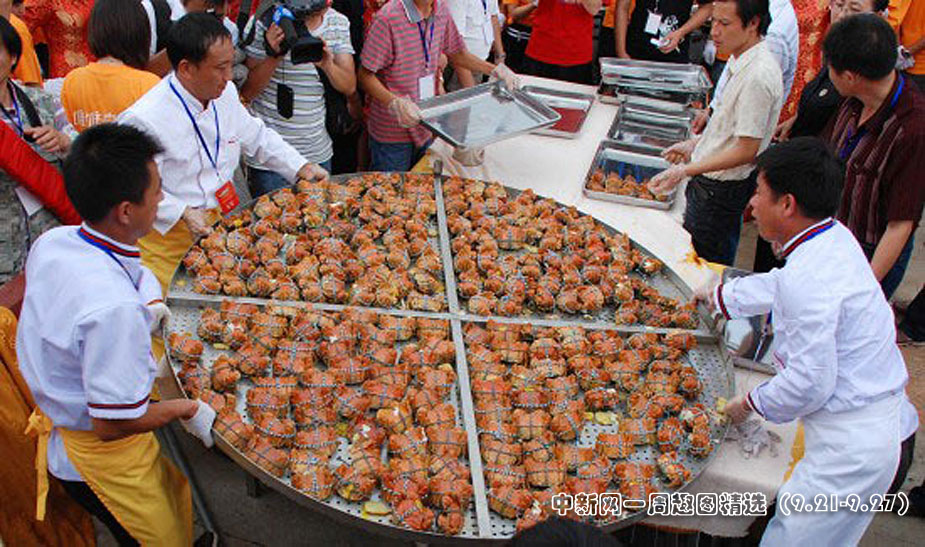 9月26日,蘇州唯亭鎮(zhèn)陽澄湖大閘蟹開捕節(jié)上一口直徑2米的大鍋一次蒸出2009只大閘蟹,并邀請?zhí)K滬杭三地市民到場共同品蟹。圖片來源:中國新聞網(wǎng)
