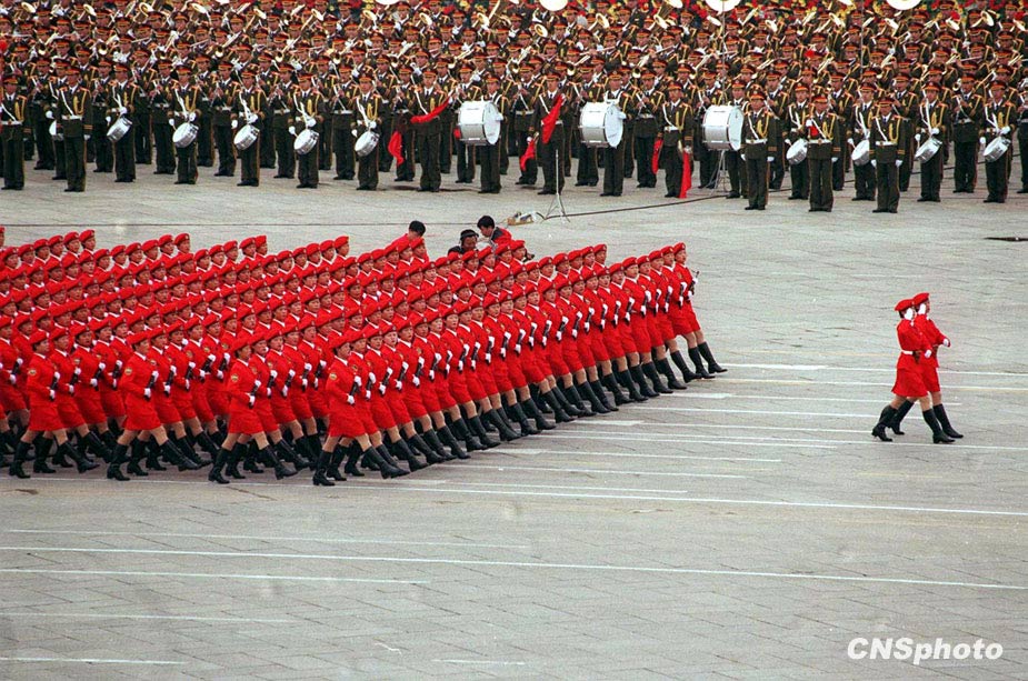 國慶50周年閱兵的女民兵方隊經(jīng)過天安門廣場。中新社發(fā)