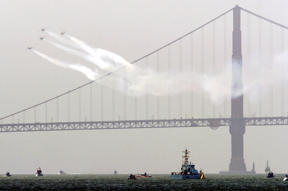 2009年10月8日,美軍飛機在舊金山灣上空進行飛行演練。一年一度的舊金山艦隊周將于10月10日開幕,屆時會有船艦游行和飛行表演等活動。 來源:中國新聞網