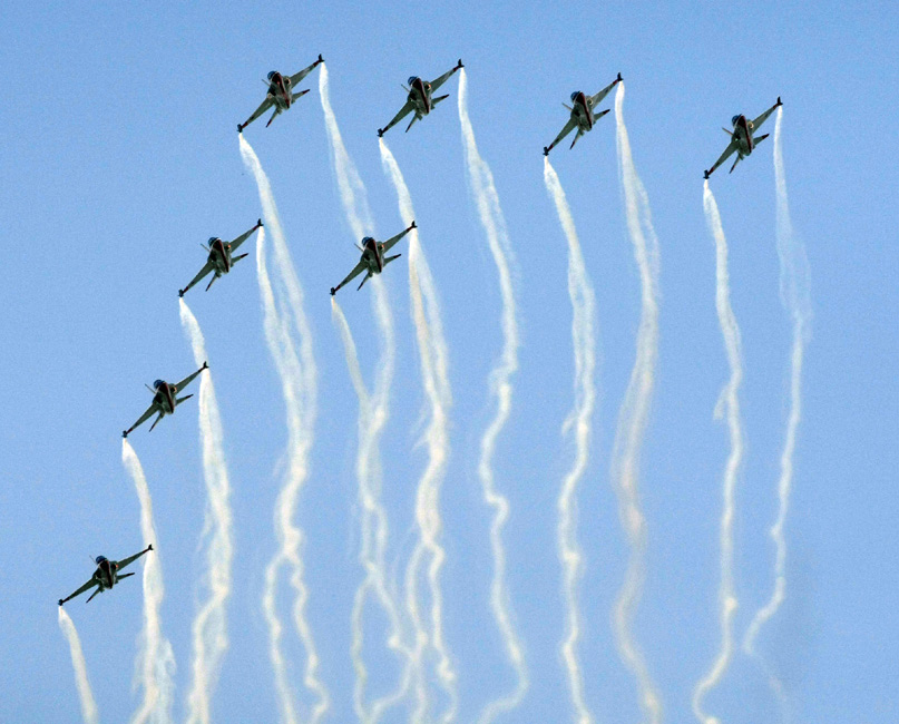 10月20日,韓國(guó)黑鷹特技飛行表演隊(duì)在2009首爾國(guó)際航空航天與國(guó)防展上進(jìn)行精彩的特技飛行表演。 圖片來(lái)源:中國(guó)新聞網(wǎng)