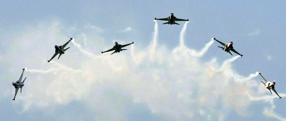 10月20日,韓國(guó)黑鷹特技飛行表演隊(duì)在2009首爾國(guó)際航空航天與國(guó)防展上進(jìn)行精彩的特技飛行表演。 圖片來(lái)源:中國(guó)新聞網(wǎng)