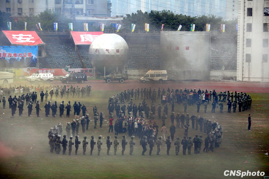 10月23日下午3時(shí)40分,推進(jìn)“平安重慶”建設(shè)突發(fā)事件應(yīng)急演練在該市渝中區(qū)大田灣體育場舉行,重慶各警種突精銳力量重裝登場,將各類事件一一化解。圖為演練處置暴力騷亂事件中,處置隊(duì)成“包圍隊(duì)形”將“暴徒”控制。中新社發(fā) 曹多然 攝